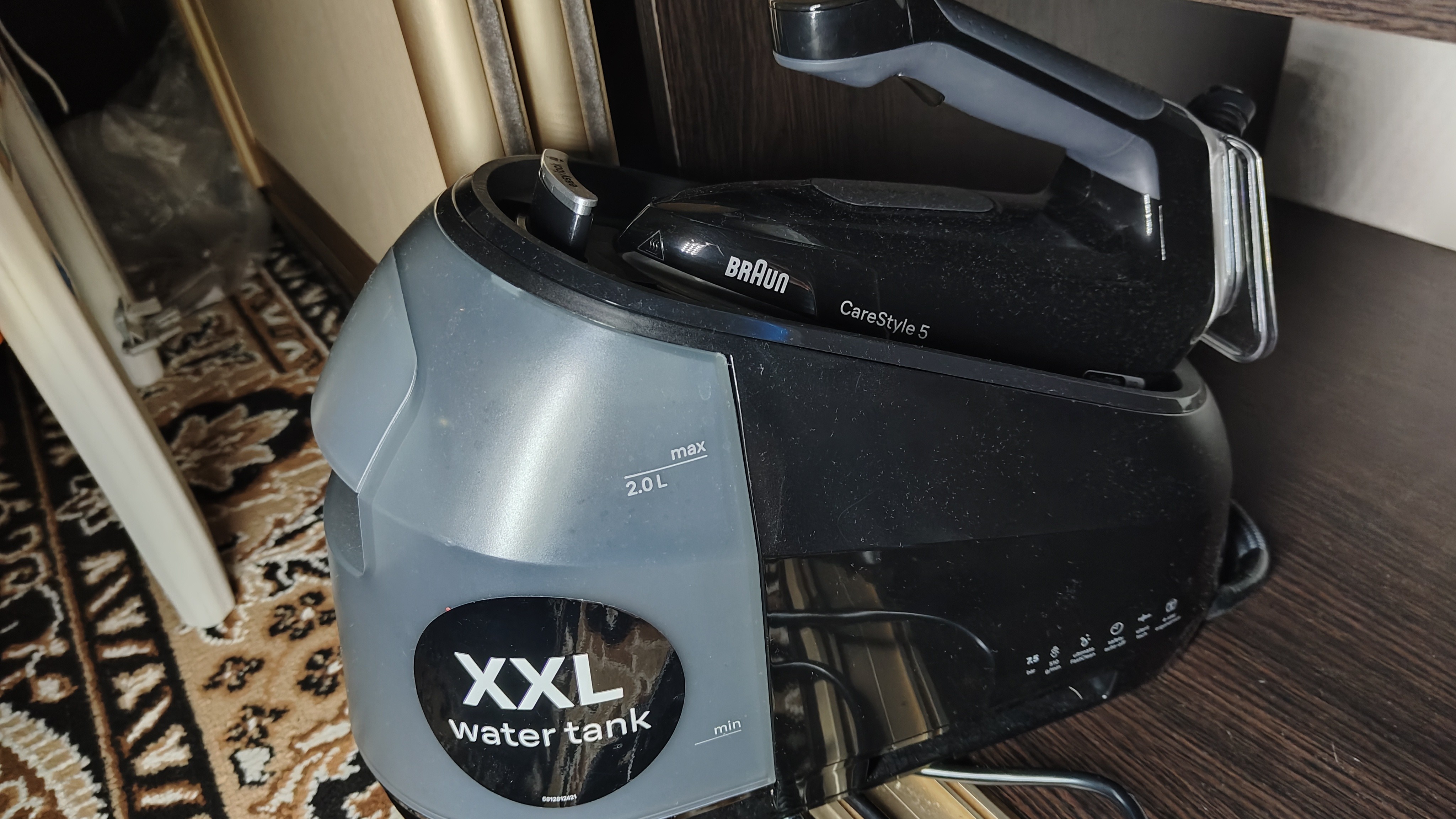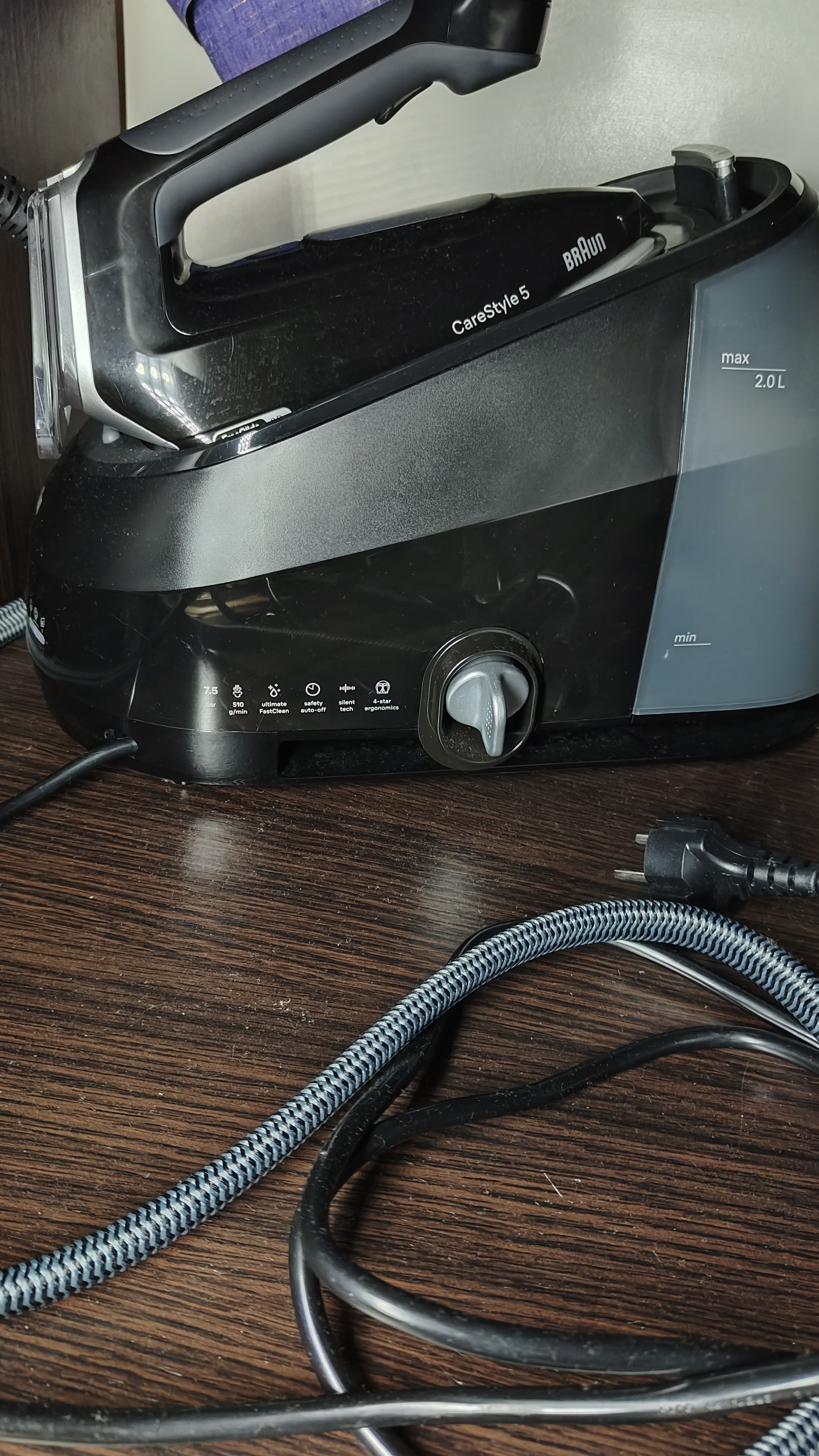 Утюг с парогенератором из серии Braun CareStyle 5 имеет достаточно высокий ценник, но при этом отличается стильным дизайном, производительностью и продвинутыми функциями для более эффективной глажки. Его мощность составляет 2400 Вт, обеспечивая быстрый нагрев подошвы и интенсивную подачу пара. Вы можете использовать постоянную подачу пара со скоростью до 150 г/мин либо кратковременный, но более мощный паровой удар с показателем 510 г/мин.