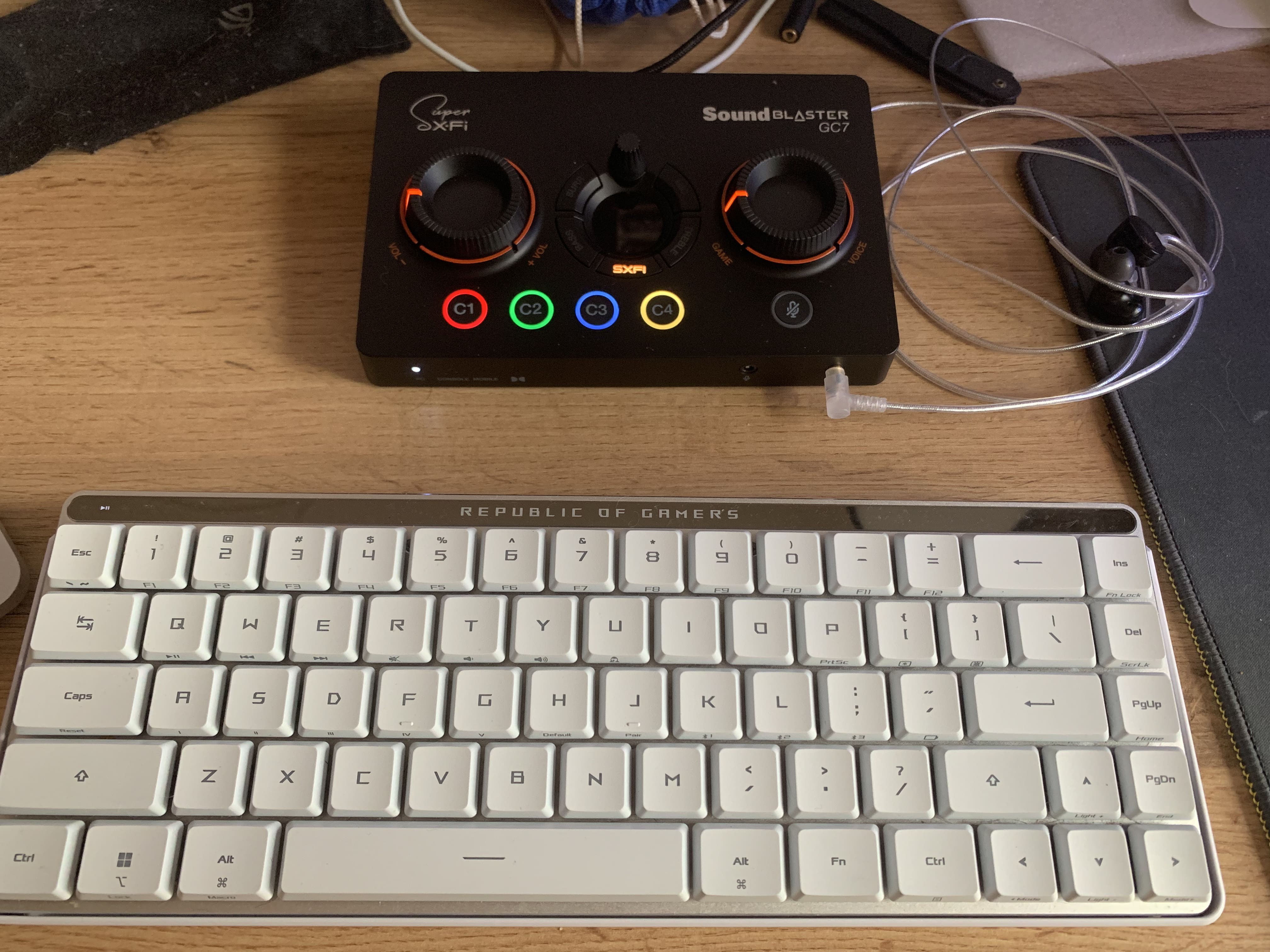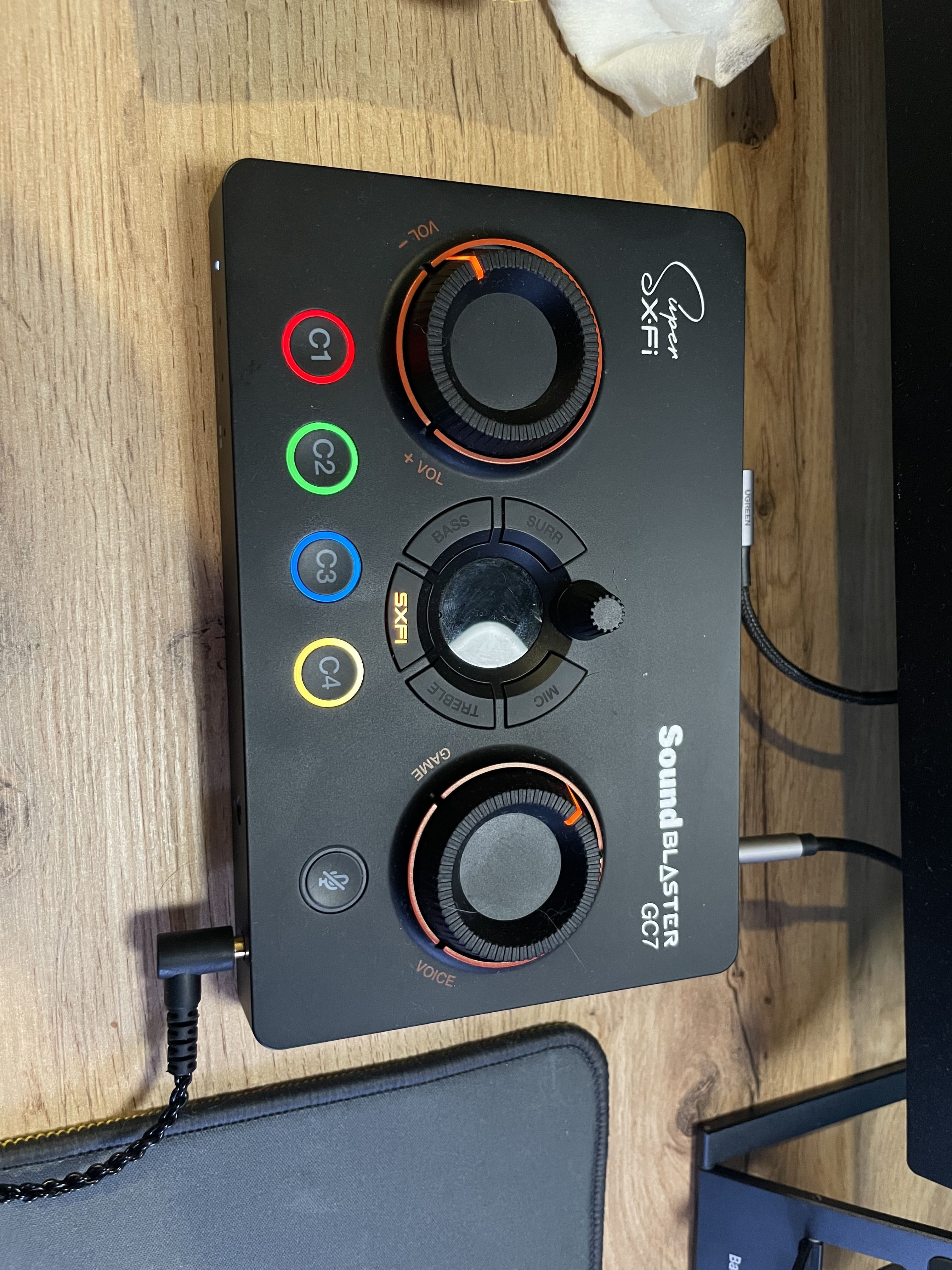 Creative Sound Blaster GC7 приємно здивував. Звук чистий, обʼємний, ефекти працюють адекватно, а регулятори та кнопки — просто знахідка для ігор і стрімів. Дуже зручна річ, якщо хочеш швидко перемикати профілі, регулювати гучність або робити тонкі налаштування на льоту. Але важливо: комплектні дроти слабкі, і їх обовʼязково треба міняти, щоб пристрій розкрився повністю й не було артефактів або шумів. шикарний, деталізований звук;