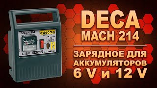 Зарядне Deca Mach 214, потужності 50 Вт, працює від 220 В із 6-ти та 12-вольтними свинцево-кислотними акумуляторами (WET, GEL... еще, AGM). Сила струму становить 4 А. Ємність акумуляторних батарей у діапазоні 15-60 Ач. Має лише 1 ступінь заряду, захисний механізм від перегріву або короткого замикання. Важить переносний пристрій, що доставляється з клемами і кабелем (2 м), 1.3 кг. Заряджає акумулятор з