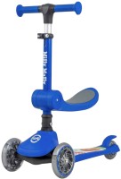 Трансформируется из трехколесного кикборда в классический двухколесный самокат. Складываемые ручки руля.
