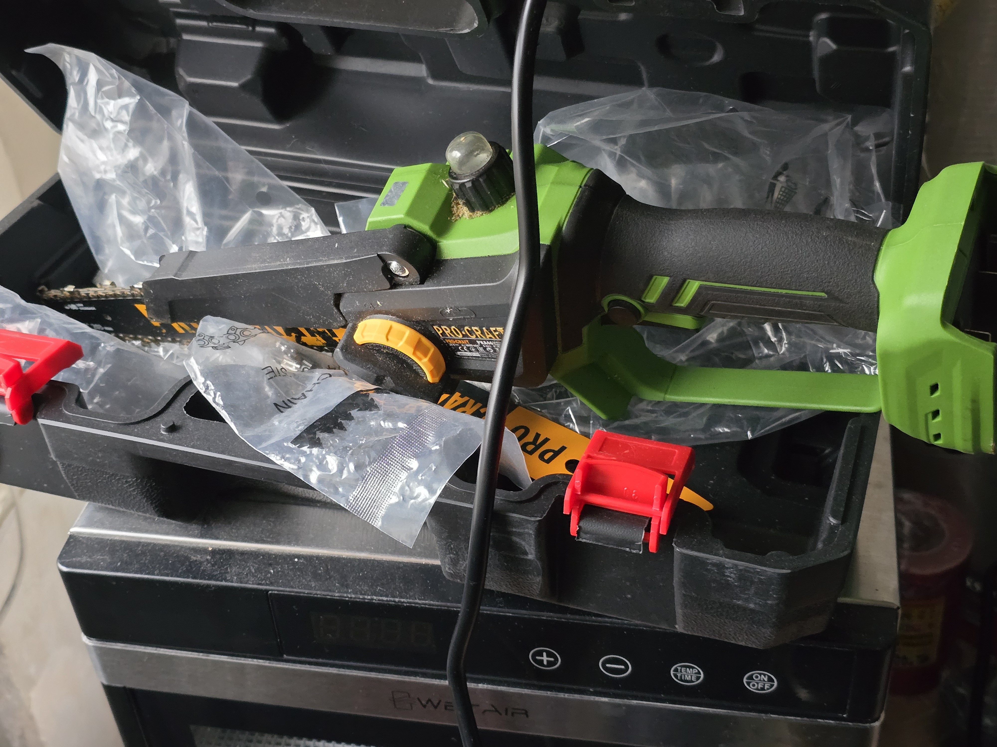 Дуже раджу докупити розширений фірмовий акум, бо комплектних вистачає не на довго. Перше що фіксую - це якість матеріалів та збірки. Нічого не смердить, не люфтить і не викликає нарікань. Далі вже йде гарний комплект: 2 ланцюги, 2 шини, 2 акуми. Інструкція чітка та зрозуміла. В мене ніколи таких девайсів не було, тож розібрався швидко і все легко зібрав. Оскільки маю бензопилку, то мастило для ланцюга в мене було, заправив шприцем, десь 10 мл влізло.