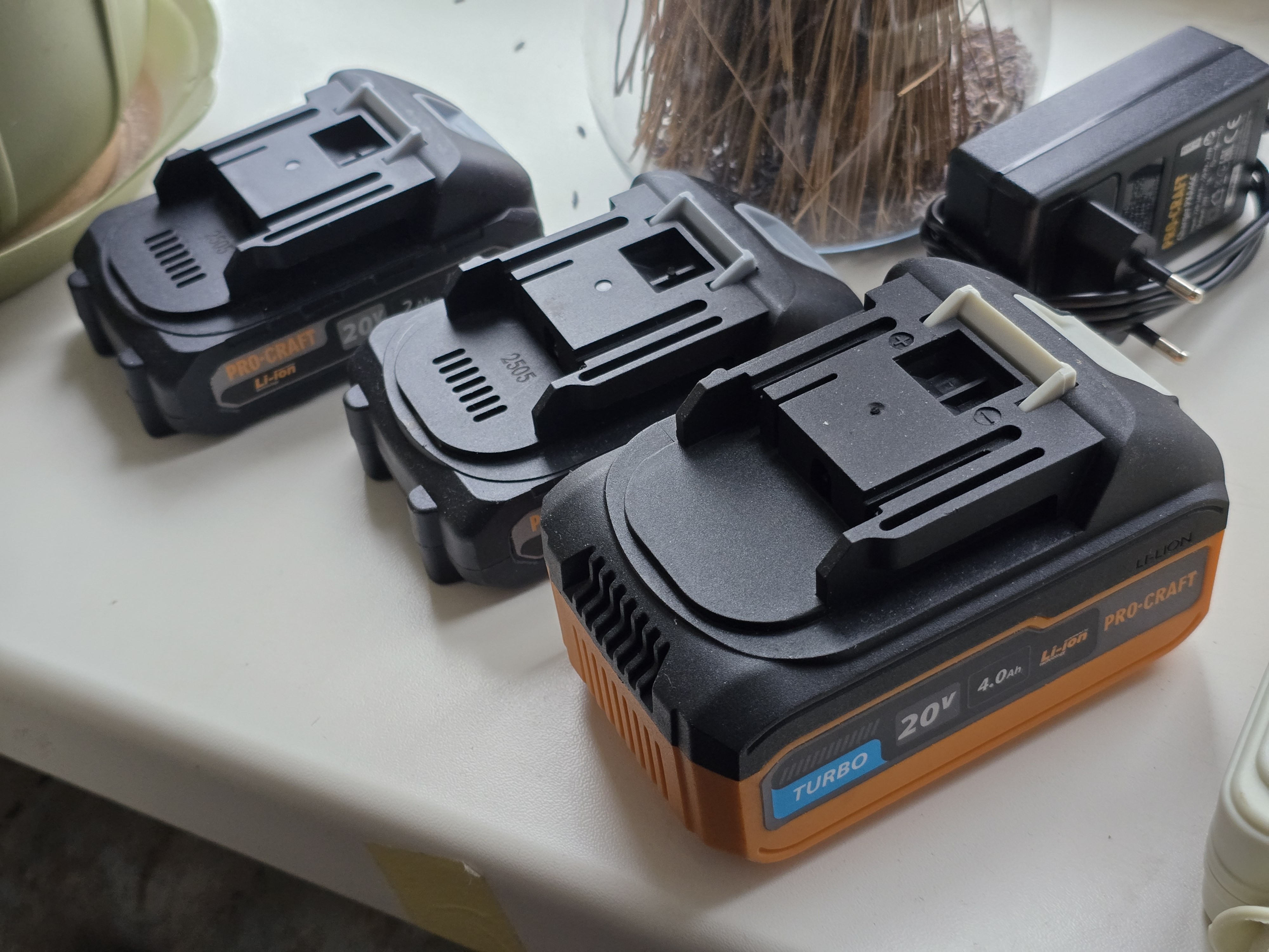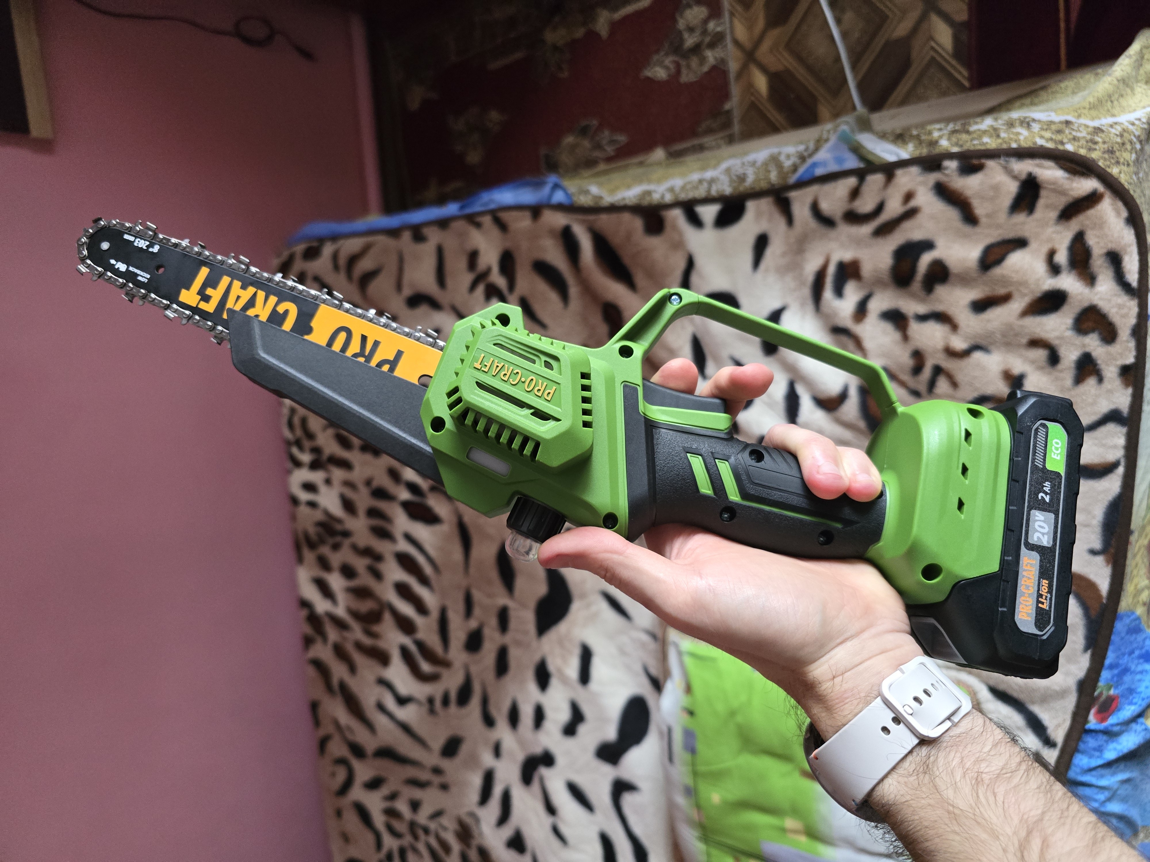 Конструкция механизма крепления оснастки позволяет снимать и устанавливать шину или регулировать натяжение цепи, не используя ключи и отвертки. В качестве источников питания используются сменные литий-ионные аккумуляторы Procraft Battery20. В комплекте есть две батареи, каждая из которых имеет емкость 2 Ач, и устройство для их зарядки. К инструменту также прилагается небольшой пластиковый кейс, в котором удобно хранить цепную пилу вместе с принадлежностями.