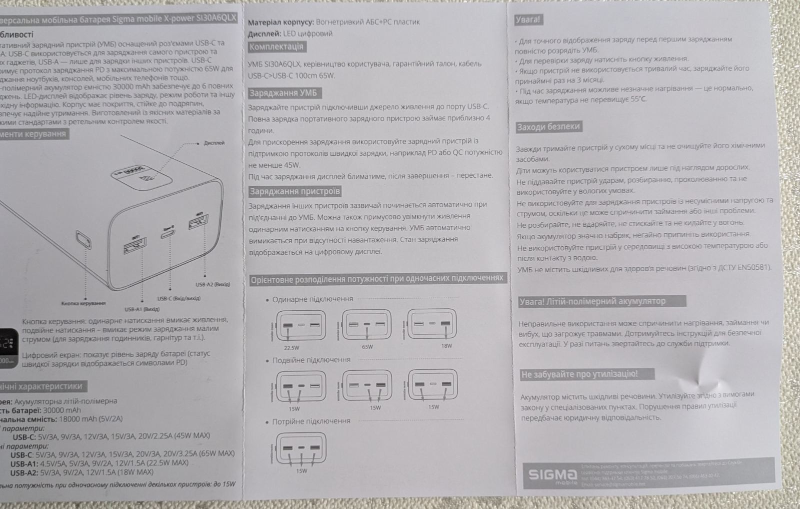 Зовнішній акумулятор Sigma Power Bank 30000mAh мобільний X-power 65W Black (SI30A6QLX) | 1 999 грн. | ![]() | |||