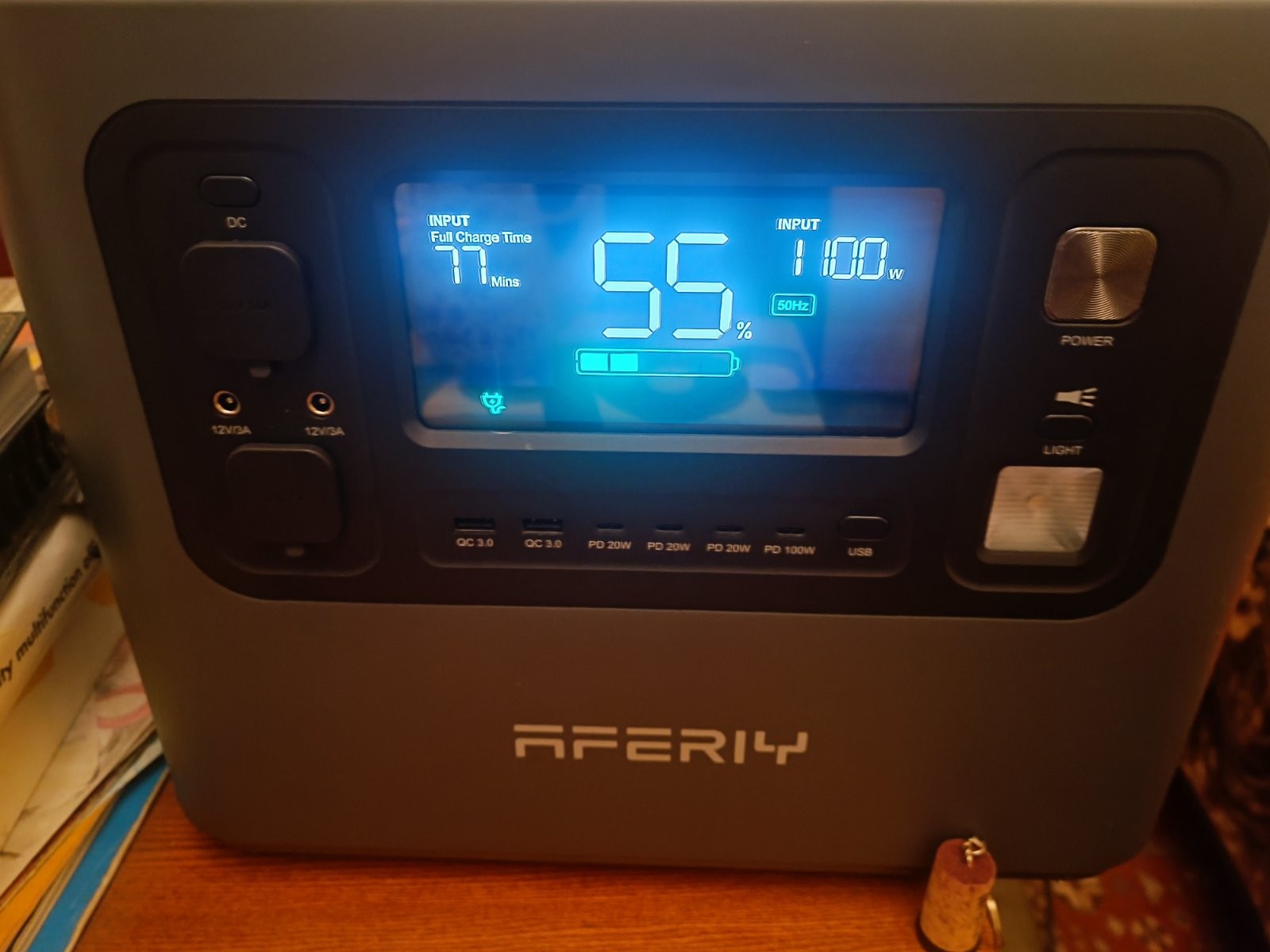 Від побутової електромережі батарея повністю заряджається приблизно за 120 хвилин при вхідній потужності 1100 Вт, від сонячних панелей потужністю до 500 Вт через порт ХТ60 — за 270 хвилин, а комбінована зарядка від мережі та сонця скорочує час до 102 хвилин. Станція має три розетки на 230 В з чистою синусоїдою, два USB A-порти з швидкою зарядкою до 18 Вт, чотири USB C-роз'єми (один на 100 Вт і три по 20 Вт), вихід автомобільного прикурювача і два DC- виходи — всього 13 портів для одночасного живлення різних пристроїв.