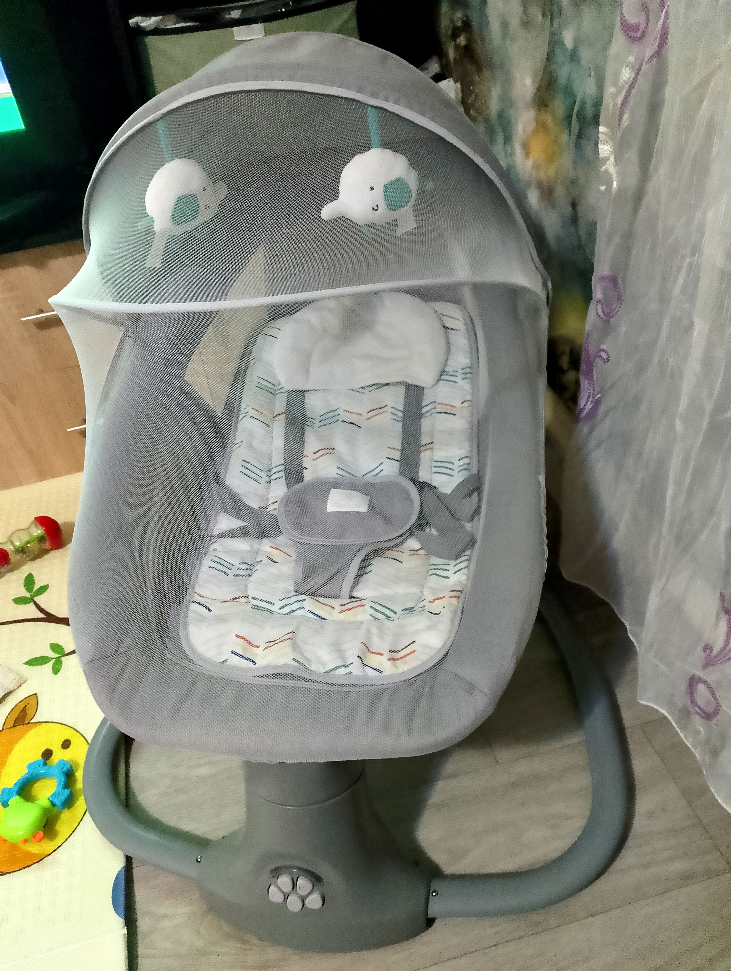 Гарний заколисувальний центр,виконує свої функції,зручний у використанні Таймер сну,різні режими коливання,ремені безпеки Трішки шумно гойдає |