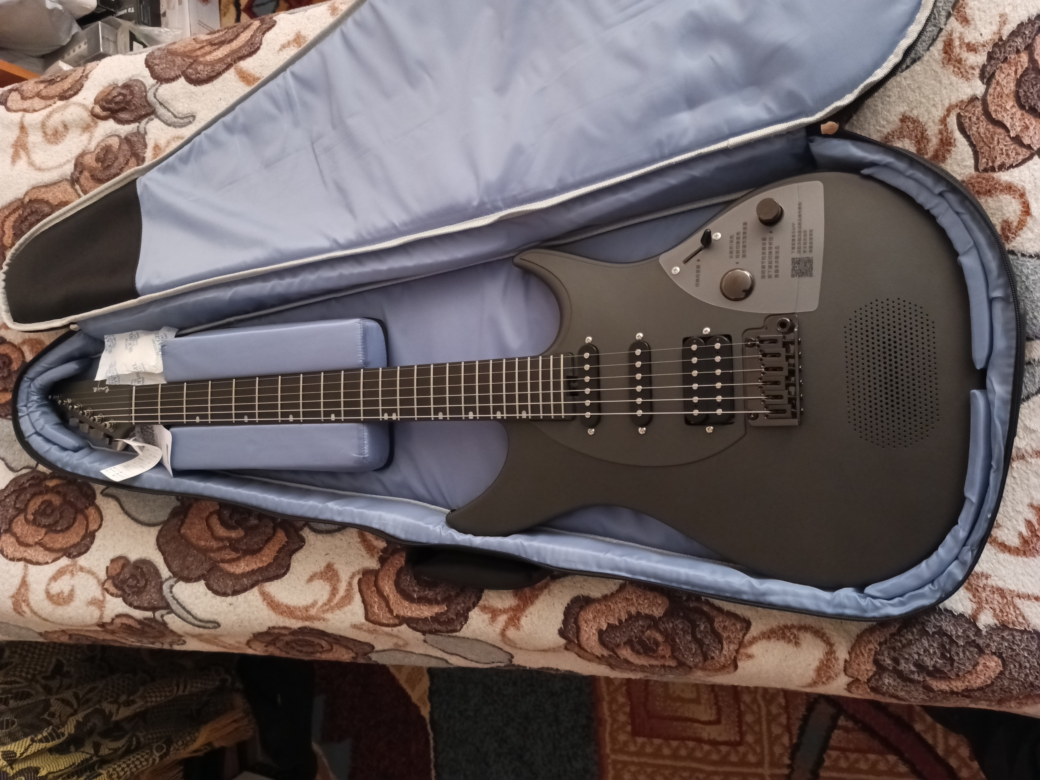 Чохол у комплекті, скошена п'ятка грифа, наявність тремоло Мене тільки дивує звукова схема виробника S-S-H |