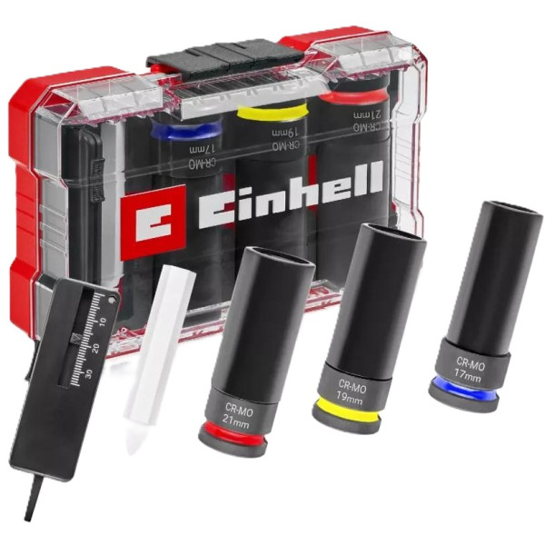 Einhell 80мм 1/2" 3 шт. (109263) 80мм1/2\"3шт.(109263)995Купити!грн.COMFY.uaЗ нами більше 10-ти років (Київ)ПоскаржитисьРозмір ключів/головок/17, 19, 21 мм|Матеріал корпусу/Сталь|Колір виробника/Чорний матовий|Тип/Набір голівок|Бренд/Einhell|Особливості, додаткові характеристики/ - Хроммолібденова сталь із марганцево ще→-фосфатним покриттям — підвищена міцність порівняно з хромванадієвою - Довжина головок 80 мм для роботи в глибоких колісних арках - Розміри: 17, 19 та 21 мм під квадратний привід 1/2" - Чорна