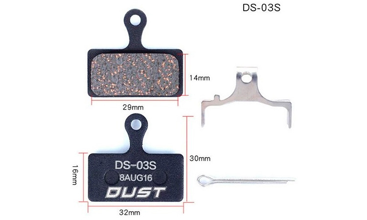 Гальмівні колодки DUST DS-03S для велосипедних гальм. Матеріал гальмівної поверхні: напівметал (semi metal pads) Сумісність: SHIMANO XTR M985,988,XT M785,SLX M666 M675,Deore M615,FSA K-Force DB-XC-9000 та FSA Afterburner DB-XC-9150 та інші.