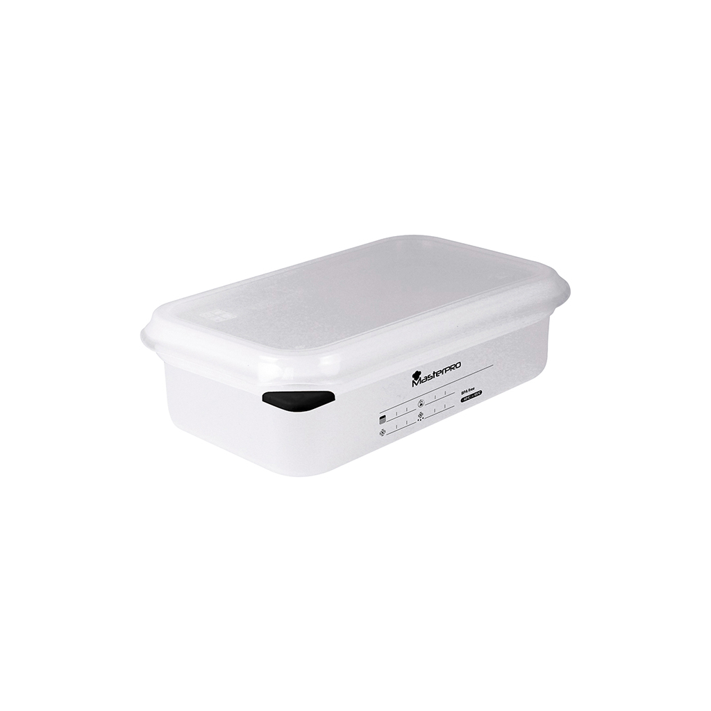 MasterPro BGEU-2942від 469 грн.Порівняти ціни4→Masterpro допоможе вам зберегти всі ваші продукти і готові страви завдяки дуже міцному герметичному контейнеру з поліпропілену об'ємом 1,8 л. Герметична кришка не пропускає повітря і зберігає все ще→всередині в найкращих умовах. Прозорий білий дизайн має секції для позначення дати зберігання і, таким чином, для більш точного контролю часу консервації. Можна використовувати в мікрохвильовій печі, холодильнику і морозильній камері. Не містить бісфенолу, легко миється, можна мити в посудомийній машині.