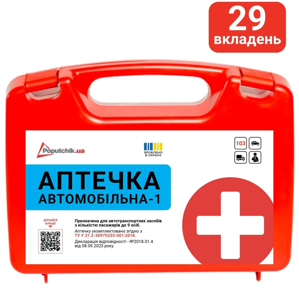 Poputchik 02-026-Мвід 718 грн.Порівняти ціни2→Автомобільна аптечка є обов'язковою складовою стандартного пакету комплектації будь-якого автотранспорту в Україні. Відповідно до пункту 31 правил дорожнього руху України «Технічний стан транс ще→портних засобів та їх оснащення» експлуатація транспорту без комплекту медичних та перев'язувальних засобів, несправного гальмівного та кермового механізму, систем освітлення чи інших технологічних елементів категорично забороняється. Аптечка Автомобільна-1 до 9 осіб (02-026-М) згідно ТУ У 21.2-35975233-001:2018 призначена для укомплектування легкових, вантажних автомобілів, а також колісних тракторів Це набір виробів медичного призначення, оснащений антисептичними, дез…